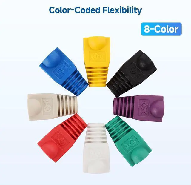 Color-coded Category 6 boots come in eight colors; Package of Cat 6 strain relief boots includes 25 boots in each color: blue, white, purple, yellow, gray, green, red, and black; Color-code networking cables for easy identification in the server room or a home office