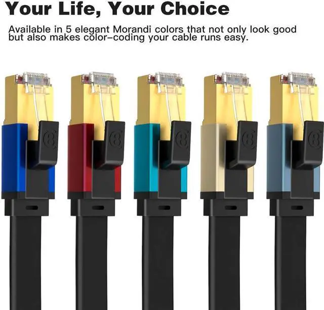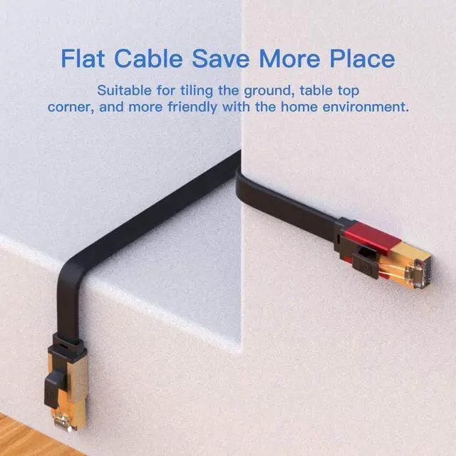 More Convenient Cat 8 RJ45 cables are in flat design to avoid tangled cords and save space. Flat Lan cable is super flexible to make it easier to hide or run along any surface. You can easily and immediately install the cable run along walls, follow edges or corners when you receive the durable gigabit ethernet cable.