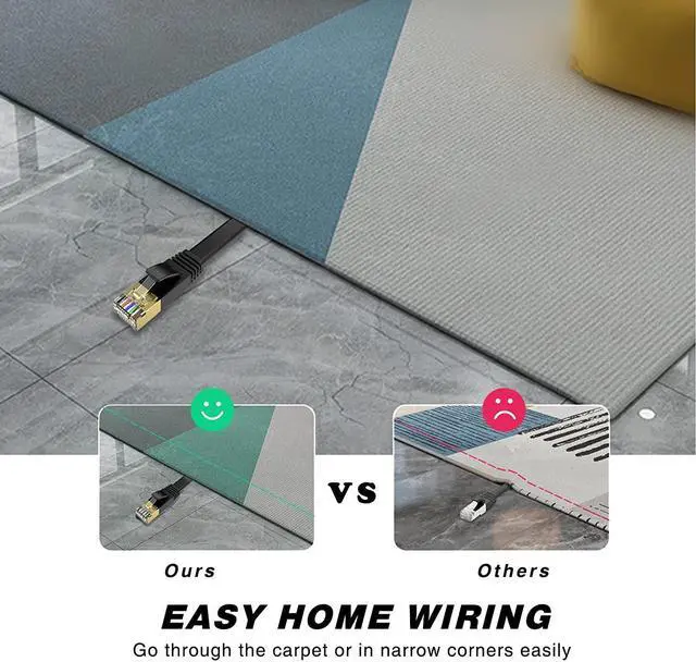 EASIER TO INSTALL Flat Ethernet cable can avoid tangled cords and save space in your home/office easier to install when running under the carpet doors rotating arms and drawers or along walls. Come with adjustable & reusable Cable Straps and clips for easing installation & storage.