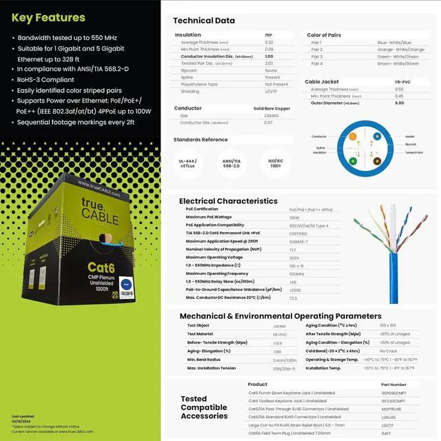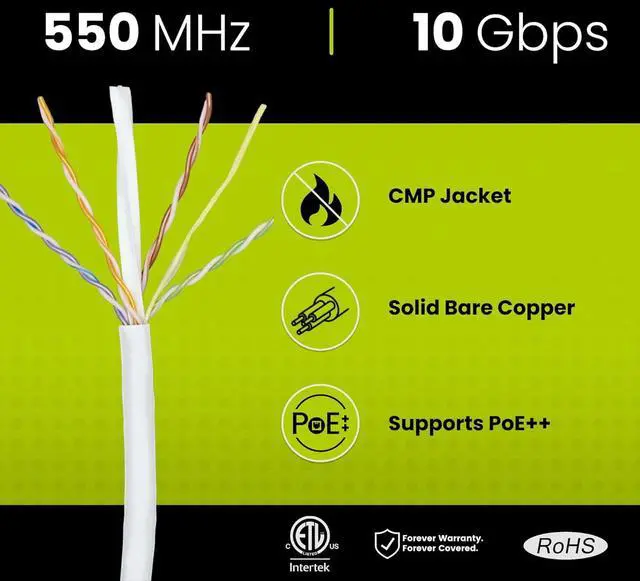 [Extreme Performance] Our Cat6 plenum Ethernet cable supports 1 and 5 Gigabit speeds up to 328ft, 10 Gigabit up to 165ft, and bandwidth tested up to 550MHz. Supports Power over