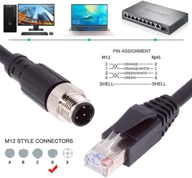 M12 to RJ45 patch cord used to connect M12 devices in industrial Ethernet and Fieldbus applications.