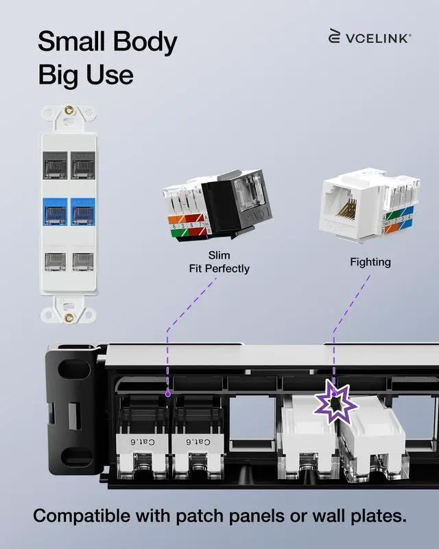 SLIM PROFILE DESIGN: Our RJ45 keystone jacks feature a slim profile, perfectly compatible with patch panels, wall plates, and surface mount boxes. The compact design ensures easy side-by-side installation in high-density patch panels without overcrowding