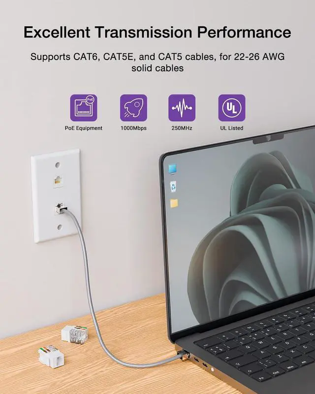 UL Listed cat6 network jacks support T568A and T568B wiring with 110-style, color-coded termination blocks; IDC terminals accept 110 impact tools and provide cable strain relief; Accept 23/24 AWG solid Ethernet cables.