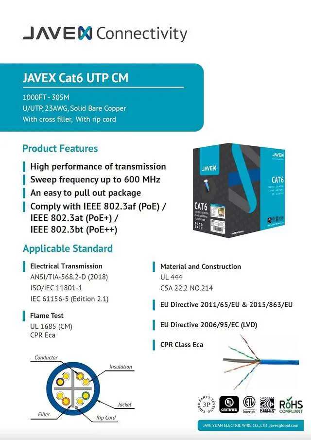 [Cat6 High-speed Shielded Transmission] JAVEX premium Cat6 23AWG CMR rated network cables meet upto-600Mhz performance to support data transmission and comply with IEEE 802.3 af (PoE) / IEEE 802.3 at (PoE+) / IEEE 802.3 bt (PoE++) in structure cabling for horizontal and building backbone