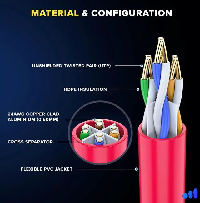 • UTP (Unshielded Twisted Pair) 4 pairs strand with separator for reduced crosstalk, molded snagless rubber boot and strain relief