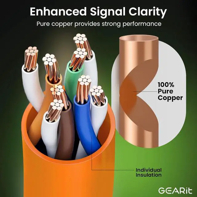 UTP 24AWG stranded conductors for flexibility, twisted in pairs, 50 micron gold-plated contacts for high-speed data transfer and corrosion resistance, as well as molded, snag-less strain relief boots for long lasting, durable connections