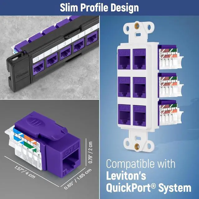 Slim Profile Design - Can be used with a patch panel, wall plate, or surface mount box with standard or slim keystone blank openings. Cat 6 keystone jack accepts 23 and 24 AWG unShielded twisted pair (UTP) cable. compatible with Leviton QuickPort System and slim Cat6 Decora style wall plates