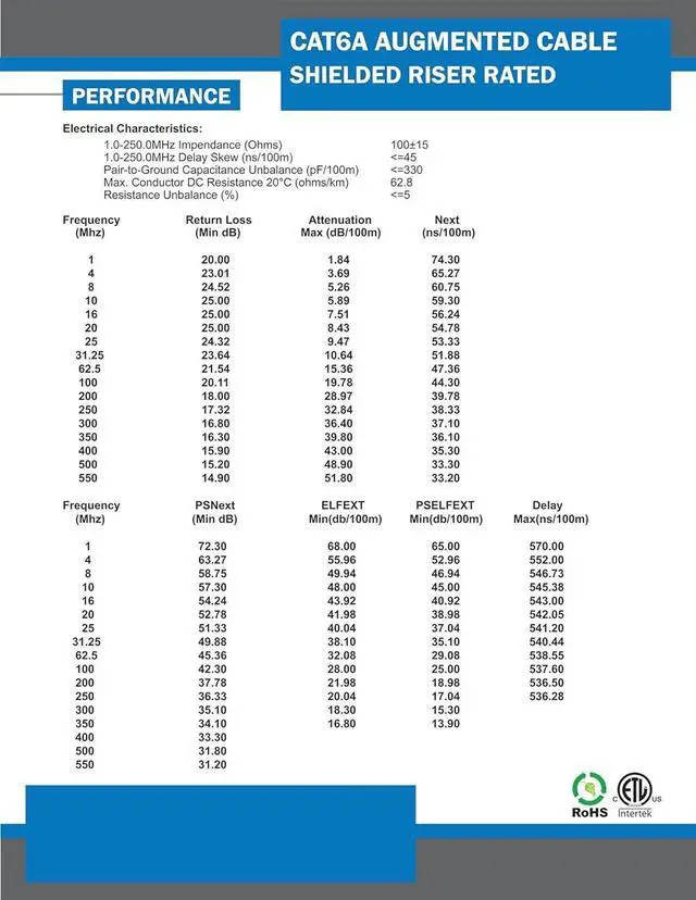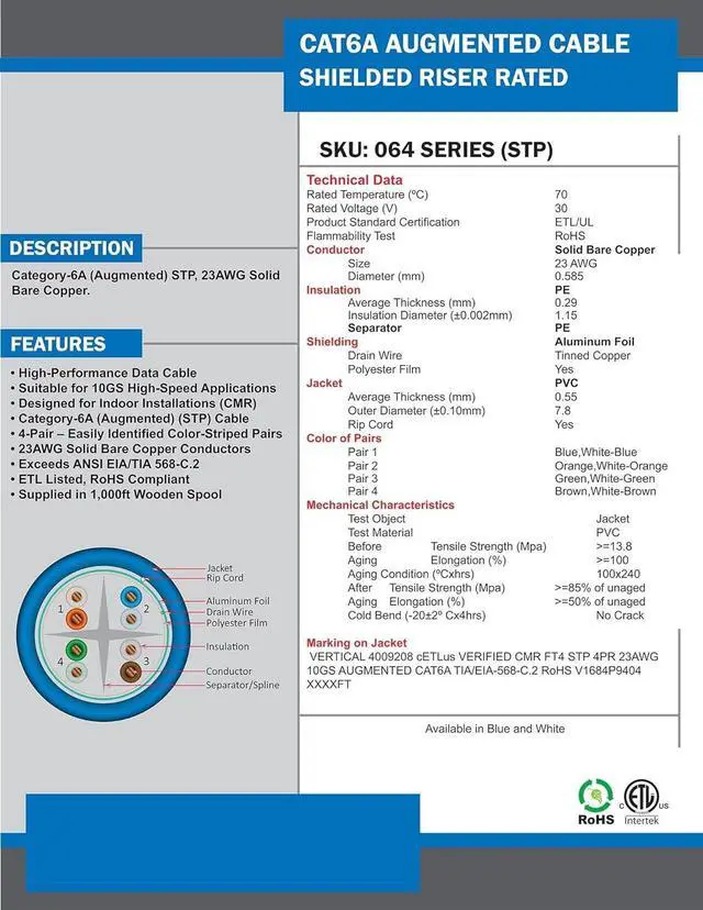 • Cat6A (Augmented) 10G F/UTP 1000 feet