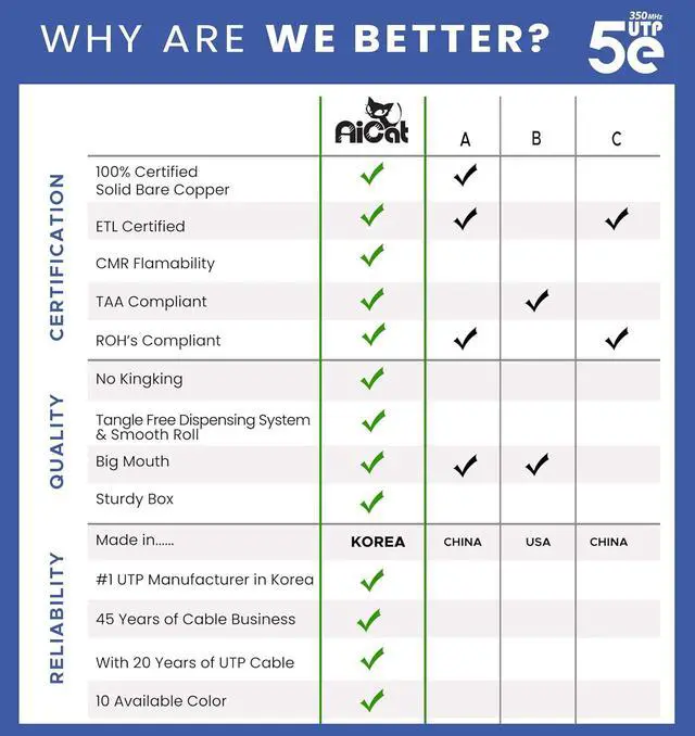 CERTIFIED AND TRACEABLE: All AiCat. Cables are CSA and ETL Certified, TAA and RoHS Compliant, and CMR flame resistant (IEC 60332-3 Cert). Each cable is part of a detailed lot tracking system, barcode traceable and comes with a full guarantee. When you order now, youll be joining thousands of companies around the world who rely on AiCat.