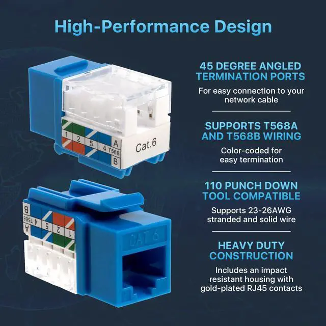 • Slim Profile, Space-Saving Design - 45° Cat6 Keystone Jacks feature a low-profile build for tight spaces and a clean, professional finish without sacrificing performance.