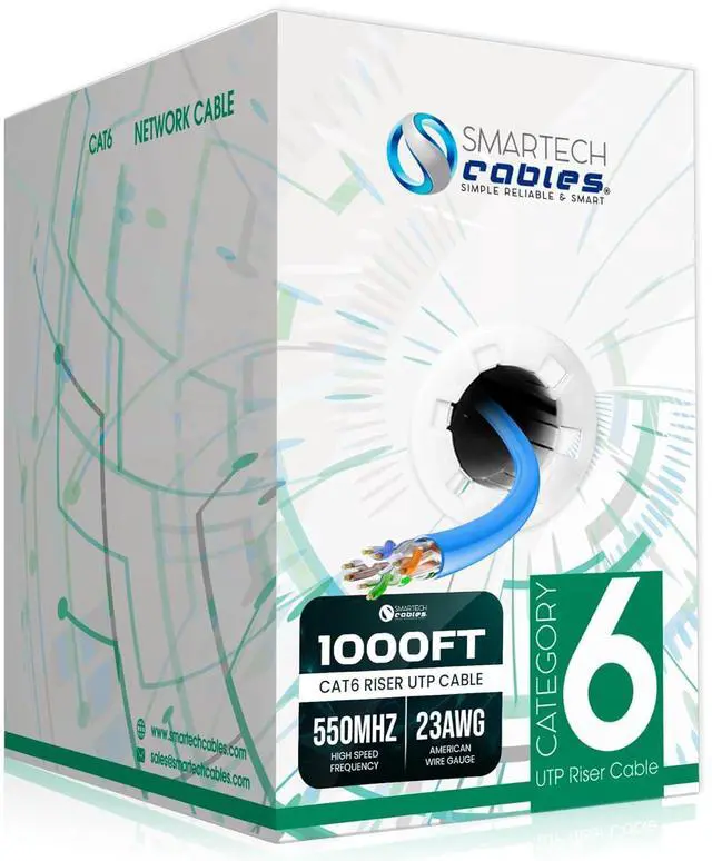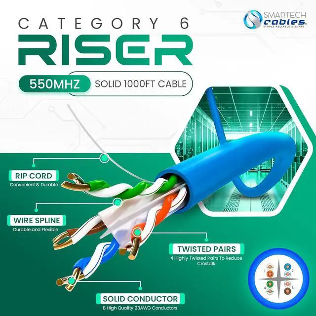 : This bulk cat 6 ethernet cable 1000ft is riser-rated (CMR) for safe in-wall vertical installations in homes, offices, and data centers. Built with 4 unshielded twisted pairs (UTP) and 23AWG copper clad aluminum conductors, this 1000 ft cat6 cable ensures strong signal integrity, reduced crosstalk, and dependable performance in structured cabling systems.