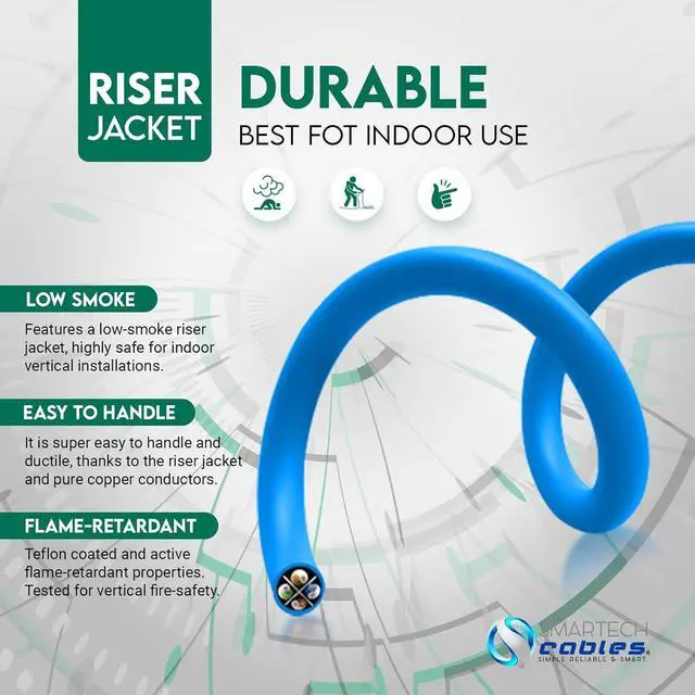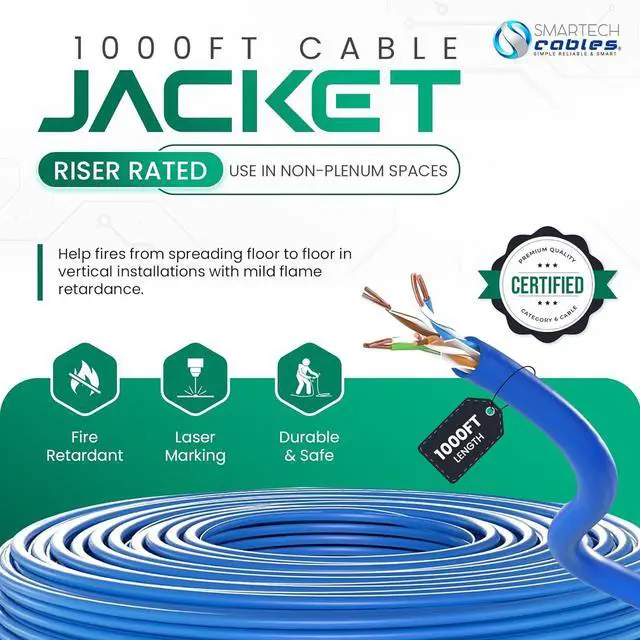 -: Engineered with a strong fire-retardant CMR jacket, this cat 6 riser cable prevents flame propagation for added safety. Rigorously tested for quality and compliance, this bulk cat 6 cable 1000ft offers superior performance while minimizing EMI, noise, and signal loss. An ideal cat6 1000ft cable choice for non-plenum indoor runs.