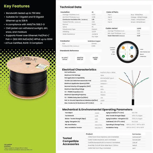 [ Field Tested, Customer Approved] Our Cat6A Direct Burial Unshielded Ethernet Cables have been performance tested with a Fluke DSX-8000 Versiv CableAnalyzer and are in compliance with ANSI/TIA 568.3 -D standards. Further, our Cat6A Direct Burial Unshielded Ethernet Cables have been end face Certified to IEC 61300-3-35 ED. 2 MM. ETL Listed. Trusted by installers for reliable performance. Backed by our superior customer support.