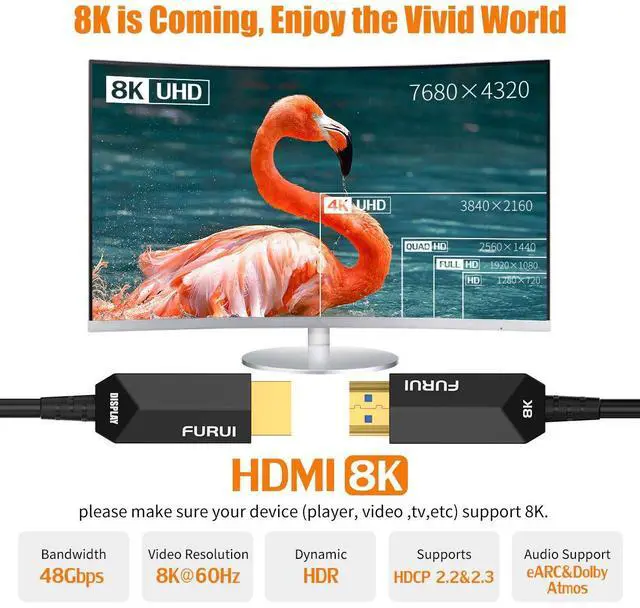 8K@60Hz & 4K@120HzThe FURUI 8K fiber optic HDMI cable 50 ft support long distance at 8K@60Hz, 4K@60Hz/120Hz & up to 10K resolution. No signal loss. Compatible with Dolby Atmos, Dolby Vision, HDCP 2.2 & 2.3, DTS: X, Dynamic HDR, BT. 2020, eARC, ALLM, QFT, QMS, VRR. Backward compatible with earlier versions of HDMI. If you need higher refresh rate (like, 4K@120Hz) please make sure your device support it. please make sure your device (player, video, tv, etc) support 8K.