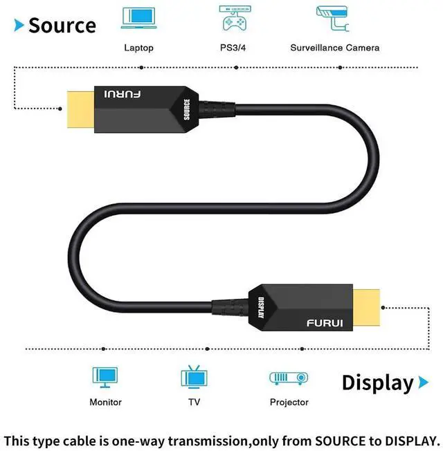 One-way TransmissionOptical HDMI 2.1 cable is one-way transmission " SOURCE" plug for connecting HDMI source(Blu-ray, STBox etc. ) DISPLAY plug for connecting your HDMI display device(TV, cinema projector, etc. )