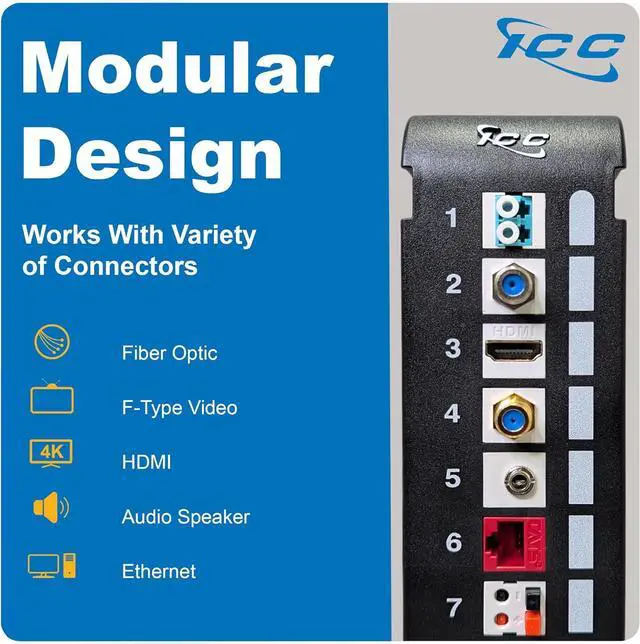 MODULAR DESIGN: Compatible with slim-profile keystone jacks, including CAT6A, CAT6, CAT5e, HDMI, RCA, USB, and F-Type, for flexible configurations in data, voice, audio, and video applications. Use with ICCs Keystone Connector Removal Tool (SKU: ICACSP481) for quick and easy connector removal in high-density installations.