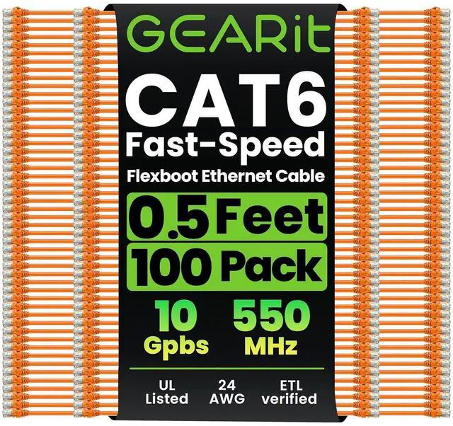 GEARit 100-Pack Cat6 Patch Cable 0.5 Foot / 6 Inches Cat 6 Ethernet Cable Snagless Flexible Soft Tab - Premium Series - Orange
