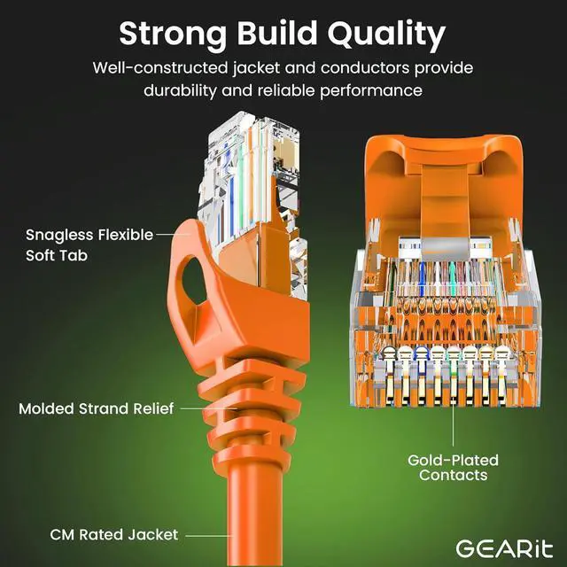 UTP 24AWG stranded conductors for flexibility, twisted in pairs, 50 micron gold-plated contacts for high-speed data transfer and corrosion resistance, as well as molded, snag-less strain relief boots for long lasting, durable connections
