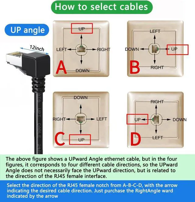 UPAngle ";: The Cat6 Right angle ethernet cable RJ45 Connector Shrapnel switch is UPward, and the cable faces to the UP ward. or RJ45 Connector Shrapnel switch is DOWNward, and the cable faces to the DOWN ward.