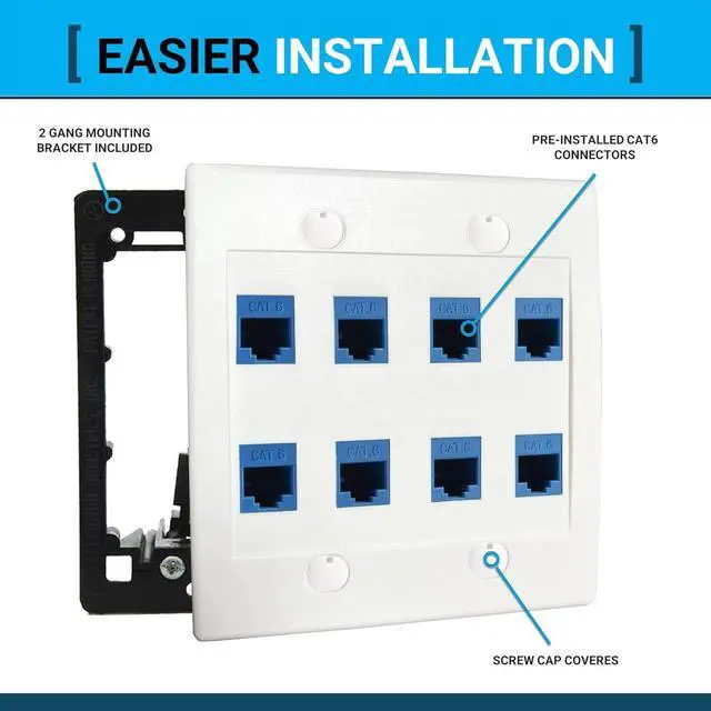8 Port Ethernet Wall Jacks - Our Ethernet Wall Plate comes with a ample amount of Cat 6 RJ45 Jacks installed. Easily accommodate many network devices, and have ports to spare.