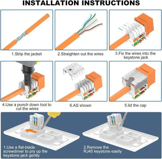 EASY TO INSTALL: The color labeling on the cat6 jack can help you avoid wrong wire lining problems and waste. The sharp IDC terminates can hold wires firmly in place. The keystone jack is also reusable, so it' s cost-effective and convenient for you to replace the ethernet cables.