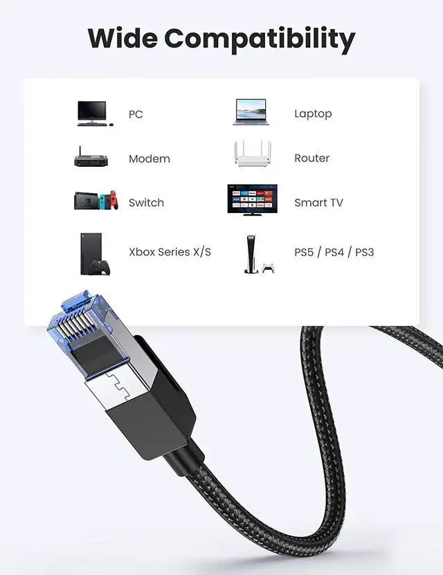 Wide Compatibility: With the RJ45 Connector, UGREEN Gigabit Cat 8 ethernet cable can be perfectly compatible with computers, laptops, modems, routers, PS5, PS4, PS3, X-Box 360, X-Box One, Switch, networking switches, ADSL, network adapters, hubs, and other networking devices. It can also be fully backward compatible with Cat7, Cat6e, Cat6, Cat5e, Cat5.