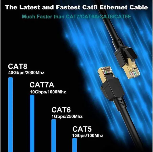 • Cat8 precision twisted SFTP ethernet cable operates at a frequency of 2 GHz (2000 MHz), which enables higher bandwidth and requires shielding and is regarded as a new option for emerging 25GBASE-T and 40GBASE-T networks