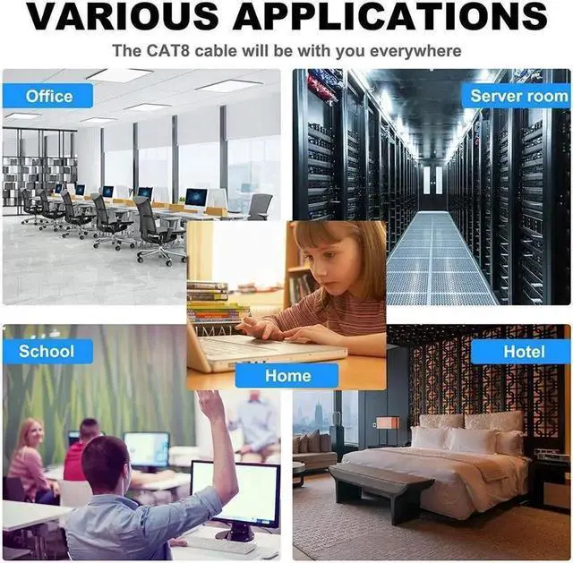 Ultra Internet speed Cat8 precision twisted SFTP ethernet cable operates at a frequency of 2 GHz (2000 MHz), which enables higher bandwidth and requires shielding and is regarded as a new option for emerging 25GBASE-T and 40GBASE-T networks Universal Compatibility Cat8 patch cable is fully backward compatible with all the previous(cat5, cat5e, cat6, cat6a and cat7) RJ45 cabling and equipment. And Rj45 network cable is faster than cat5, cat5e, cat6 patch cords, you will have an better experience in using Dacrown cat 8 fast speed ethernet cord. Faster Data Transmission Rate Dacrown UL Rated Cat 8 Cable is designed to support 25GBASE-T and 40GBASE-T applications, it is suitable for small or middle enterprise LANs, especially for data center switch-to-server interconnections.