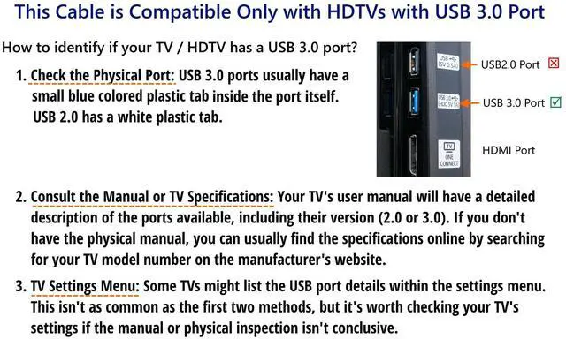 IMPORTANT HDTV / TV Compatibility Note: This is compatible only with new HDTVs with USB 3.0 port. Please see "Product Description" or product pictures on how to identify if your TV / HDTV has a USB 3.0 port.