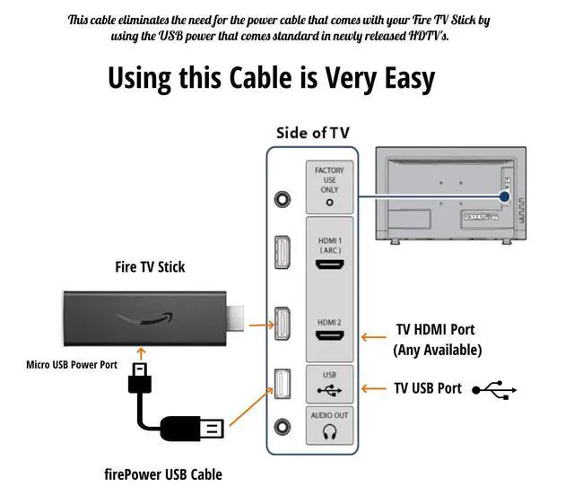 REMOVE-THE-CLUTTER DESIGN: Optimal length (8.5 inches) designed to power your Fire TV Stick using your TV's USB port, without the clutter (or without wires dangling from the back of your TV).