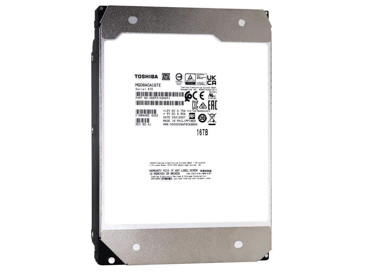 - General InformationManufacturer: ToshibaManufacturer Part Number: MG08ACA16TEManufacturer Website Address: http://www.toshiba.comBrand Name: ToshibaProduct Series: MG08Product Model: MG08ACA16TAProduct Name: Enterprise Capacity HDDMarketing Information: Using an industry-leading 9-disk design pioneered by Toshiba, the MG08 Series provides 16TB of conventional magnetic recording (CMR) capacity and 7,200 rpm performance. The industry-standard 3.5-inch form-factor integrates easily into cloud-scale storage infrastructure, business-critical servers and storage, and File and Object storage solutions. Toshiba's precision industrial laser welding technology is put to use to seal helium inside the 9-disk mechanics. The massive 16TB capacity is delivered using proven CMR recording technology providing optimum application compatibility and data reliability. Available with either a SATA 6.0 Gbit/s or a 12.0 Gbit/s SAS interface, the MG08 Series models integrate easily into standard 3.5-inch
