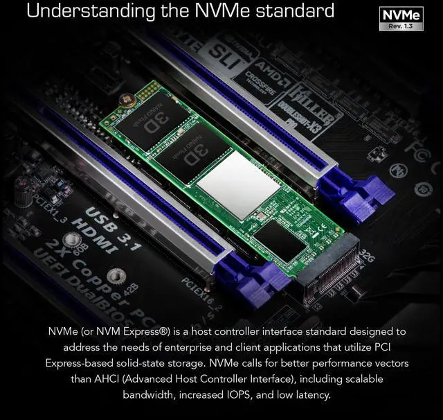 NVMe (or NVM Express® ) is a host controller interface standard designed to address the needs of enterprise and client applications that utilize PCI Express-based solid-state storage. NVMe calls for better performance vectors than AHCI (Advanced Host Controller Interface), including scalable bandwidth, increased IOPS, and low latency.