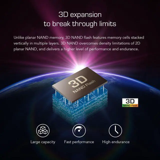 Unlike planar NAND memory, 3D NAND flash features memory cells stacked vertically in multiple layers. 3D NAND overcomes density limitations of 2D planar NAND, and delivers a higher level of performance and endurance.