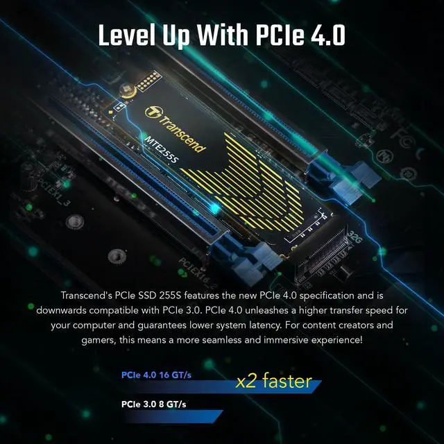 Its multi-channel controller delivers sequential R/W speeds of up to 7, 400/6, 500 MB/s, and IOPS up to 700K, delivering captivating performance and response times for desktops and laptops like you've never seen before! Level Up With PCIe 4.0 Transcend's PCIe SSD 255S features the new PCIe 4.0 specification and is downwards compatible with PCIe 3.0. PCIe 4.0 unleashes a higher transfer speed for your computer and guarantees lower system latency. For content creators and gamers, this means a more seamless and immersive experience! As Cool As Always Transcend's PCIe SSD 255S has an integrated ultrathin graphene heatsink to improve heat dissipation.