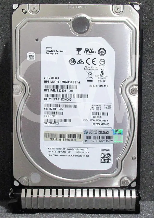 HPE 819078-001 820409-001 818365-B21 2TB 7200RPM 12Gbps Midline Hot Swap 3.5IN SAS Hard Drive MB2000JFEPA - Includes SMART CARRIER Caddy/ Tray