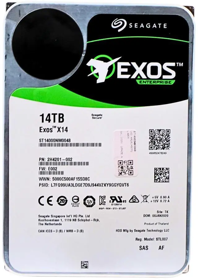General InformationManufacturer: Seagate TechnologyManufacturer Part Number: ST14000NM0048Manufacturer Website Address: http://www.seagate.comBrand Name: SeagateProduct Line: ExosProduct Series: X14Product Model: ST14000NM0048Product Name: Exos X14 ST14000NM0048 Hard DriveMarketing Information: Seagate manufactures hard drives that specifically address the needs of the hyperscale storage market. As the flagship of the Seagate® X class, the Exos™ X14 and Exos X14z enterprise hard drives are the highest-capacity hard drives in the fleet.Maximum Storage Capacity for Highest Rack Space Efficiency 14TB per drive for 40% more petabytes per rack Industry's lowest power and weight for optimum data center TCO Highest 14TB hard drive performance with enhanced caching, making it perfect for big data applications Hyperscale SATA model tuned for large data transfers PowerBalance™ feature optimizes IOPS/Watt Helium sealed-drive design with no porosity and uniform density Superior