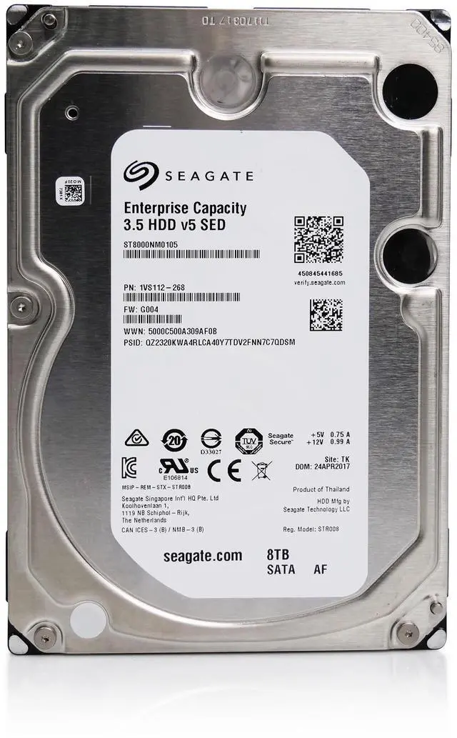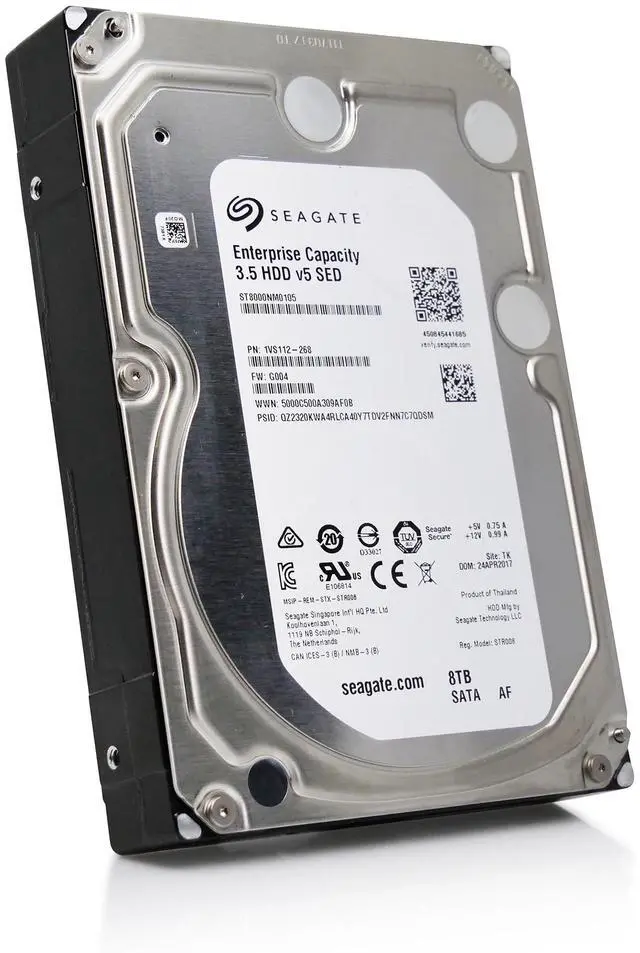 Hard DriveMarketing Information: Capacity-Optimized Enterprise Hard Drive for Bulk-Data Applications 8TB, 3.5 -inch enterprise drive with industry-leading 6-disk technology, resulting in 33% more storage in the same storage slot Advanced Write Caching feature to utilize enhanced algorithms, resulting in the industry's highest nearline storage workload performance efficiencies-100% performance improvement in random writes over last-generation drive Widely accepted, proven ninth-generation conventional perpendicular recording technology for reliable access to unstructured data in bulk storage applications 12Gb/s SAS and SATA 6Gb/s interfaces in industry-standard advanced formats for easy integration into replicated and RAID multi-drive storage servers and systems State-of-the-art cache, on-the-fly error-correction algorithms, super parity and end-to-end SAS-based data integrity for accurate data storage Industry-leading rotational vibration tolerance design helps ensure consistent performance in dense multi-drive systems Engineered for 247 workloads of 550TB/yr-10 that of desktop drives Robust performance with dual processors, ramp load technology, top-coverattached motor and humidity sensor for optimum performance in all chassis Seagate Secure™ Self-Encrypting Drive featuring Instant Secure Erase for costsaving drive retirement and secure data-at-rest protection Seagate SeaTools™ diagnostic software to provide drive self-tests ensuring unnecessary downtime and maximizing TCO Best-Fit Applications Hyperscale applications/cloud data centers with replicated storage Massive scale-out data centers and big data analytics High-capacity density RAID storage Mainstream enterprise external storage arrays (SAN, NAS, DAS) Distributed file systems, including Hadoop and Ceph Enterprise backup and restore-D2D, virtual tape Centralized surveillance