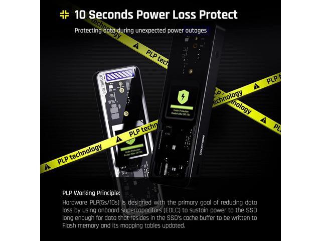 - The Power Loss Protection of DOCKCASE Smart SSD Enclosure provides around 10 seconds of writing time after power failure (the actual time will be affected by the working state and power consumption of the SSD), no data loss, no disk damage.