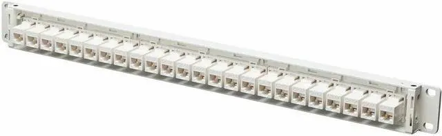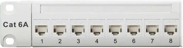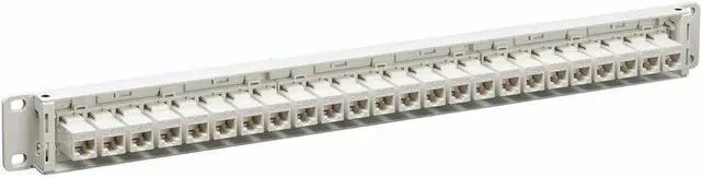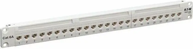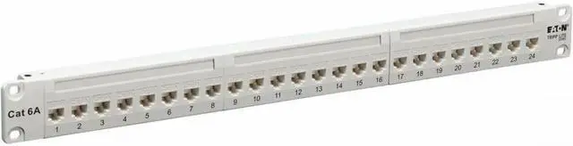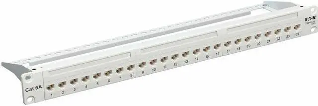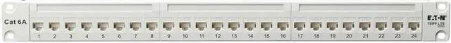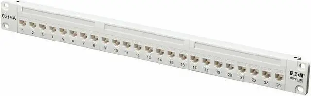 24-Port Patch Panel Manages and Organizes High-Density Cat6a Network CablingThis patch panel meets or exceeds Cat6a specifications to enable quick, easy cable patching. Just plug Cat6a cables into its 24 front and rear RJ45 feed-through ports. No punch-down termination is required. Both the front and rear connectors are clearly numbered, and the front ports have blank labels to help you identify individual cable runs. The N252-P24-WH supports EIA/TIA 568A and 568B wiring standards and is compatible with all network applications. It is fully rated for fast Ethernet data transfer speeds up to 10 Gbps.