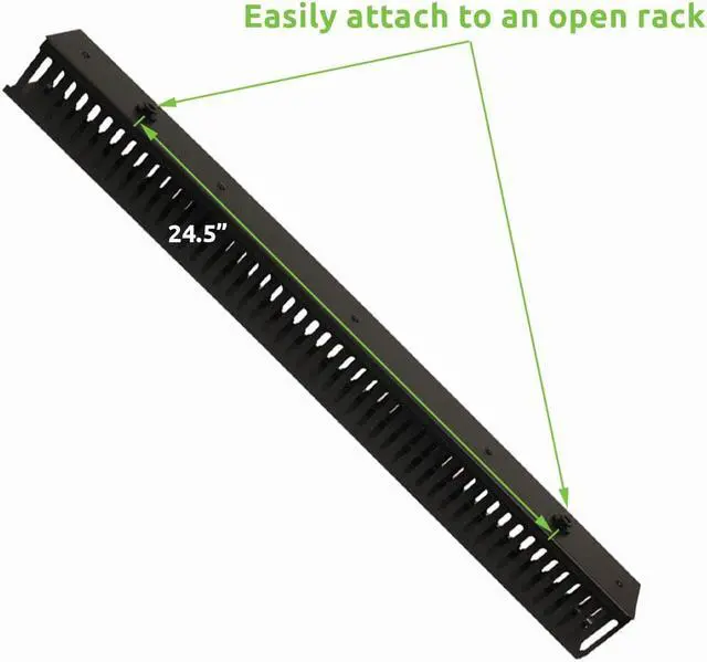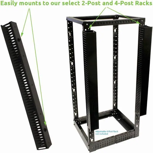 This Vertical cable manager was designed to be mounted on our 2 and 4 post racks providing a clean, beautiful and simple means of organizing small or large bundles of cables and patch cord. It's Tool-less mounting Assembly makes installation and removal easy.