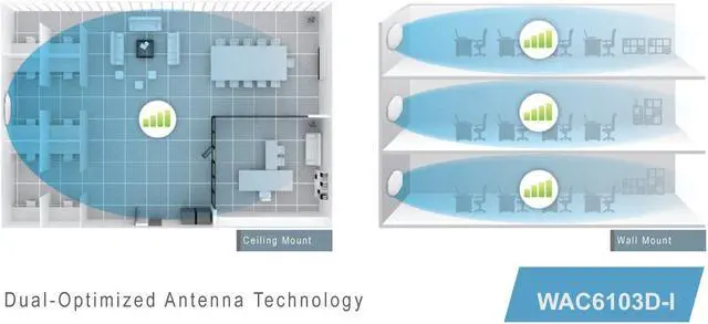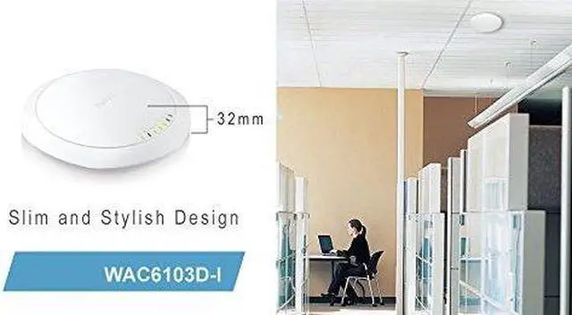 ZyXEL's WAC6103D-I is a high performance 3-stream 802.11 ac Wi-Fi AP featuring ultra-fast speeds of up to 1.75 Gbps with ground-breaking "dual-optimized" antenna design. Via the innovative adjustable antenna setting the WAC6103D-I provides the best signal coverage fitting for either ceiling-mount or wall-mount deployments. Even better the stylish ultra-slim industrial design perfectly blends into modern decorations. Choose WAC6103D-I for constant no-compromise Wi-Fi performance. Provide your business with a wireless solution that ensures a speedy and steady data transfer rateBuild a reliable home or business network with this Wireless Access Point that features IEEE 802.11 ac technology and speeds up to 1.75 Gbit/sEthernet port provides Ethernet connections for fast data transfer and large file transfers between your access point and wired networkIts management capability provides efficient control over setup and configuration of your network