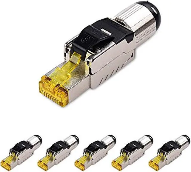 CONNECT MORE with Cable Matters Networking Products 10 Gig to 40 Gig Network Migration Solution The Cable Matters Cat 8 Shielded RJ45 Field Termination Plug provides an affordable copper based alternative for connecting 10, 25 or 50 Gigabit Ethernet channel components. It provides an affordable alternative to Twinax direct attach cable while providing backwards compatibility with Cat 7 and Cat 6A. Supports PoE+ and Cat8 data center applications for Top-of-Row, Middle-of-Row, and End-of-Row configurations up to 30 meters. Cost-Effective 6-Pack with a Lifetime Warranty This fully shielded field termination plug is designed for sensitive environments that demand security with protection against EMI/RFI electromagnetic noise and alien crosstalk.