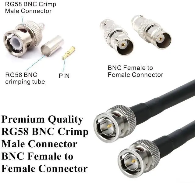 Premium quality RG58 BNC male crimp connectors; BNC female to female connectors; RG58 BNC crimping tube; RG58 heat shrink tubing
