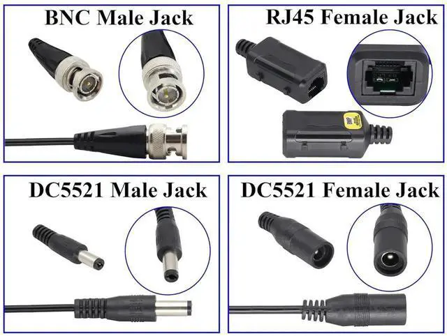 Size:Length16.5CM/6.5Inch)Colour:(Black) Package Quantity:(4 Pairs) Material:Plastic+Metal Features: Balun HD cat5/cat6 female to BNC male video baluns+DC 5.5 x 2.1mm female /male jack adapter cable