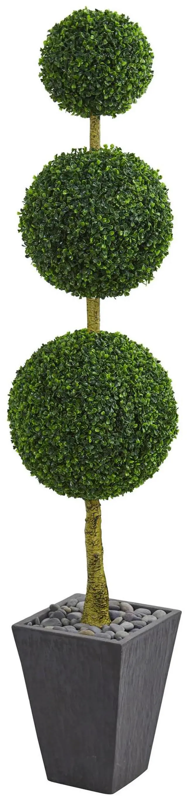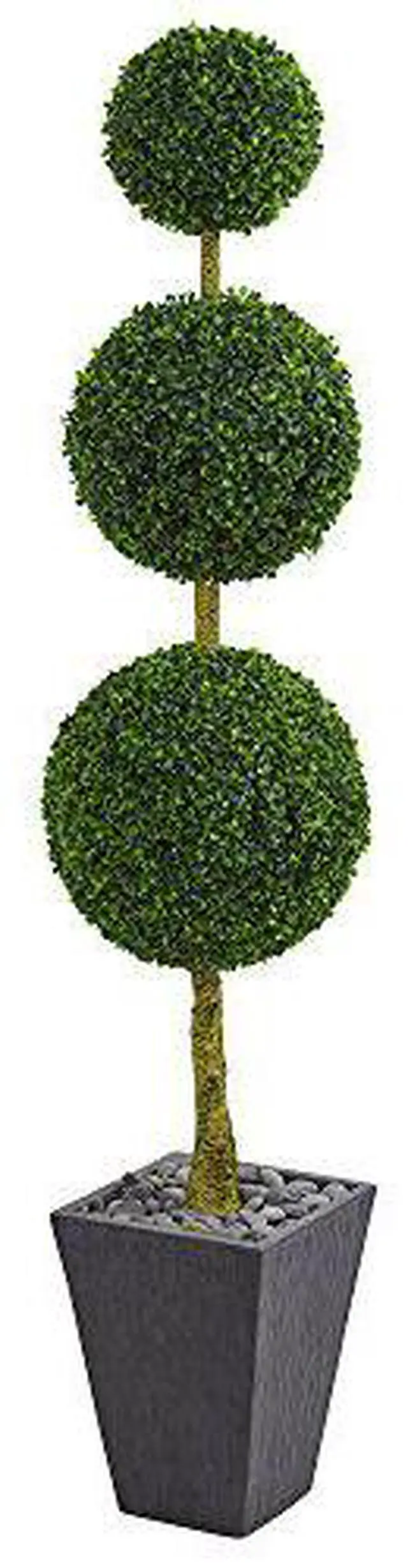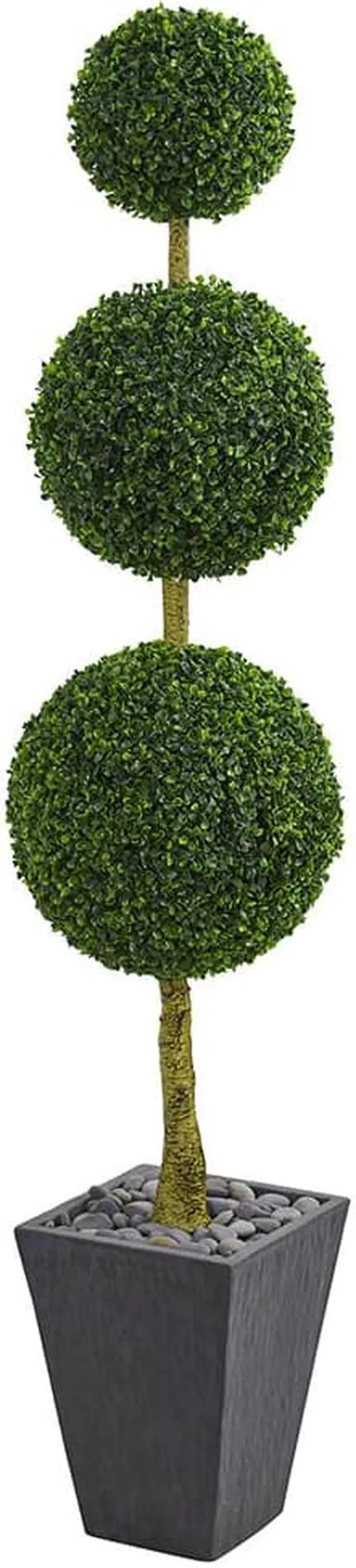 Skillfully trimmed- the artificial boxwood triple ball topiary has three sphere-shaped green topiaries that grow smaller in size as you move up the trunk. Placed in a gray slate planter with natural river rocks- this elegant artificial tree is UV-resistant and ideal for indoor or outdoor use. Use it to line a walkway for an elegant- stately feel.