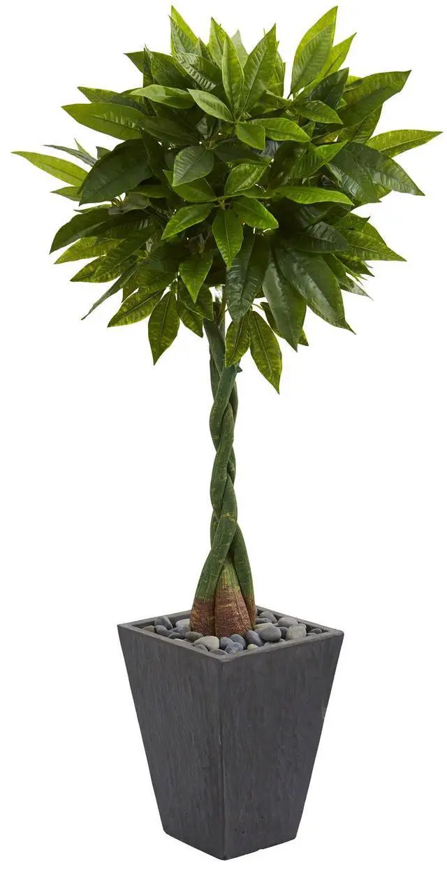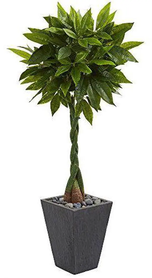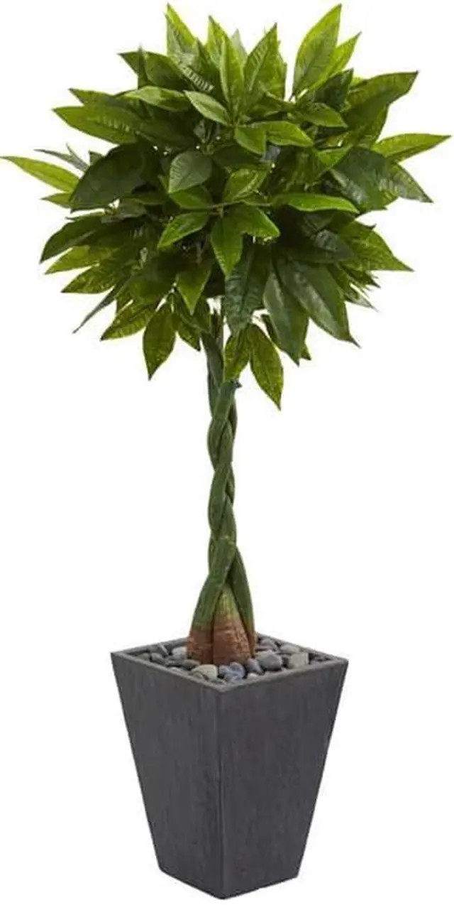 An eye-catching flourish of rich- lush- real to the touch green leaves explodes from a beautiful braided trunk. D esigned to look real- the artificial money tree comes in a slate planter with natural river rocks. Well-suited for a successful office- place the money tree somewhere that can easily be seen upon entry.