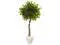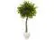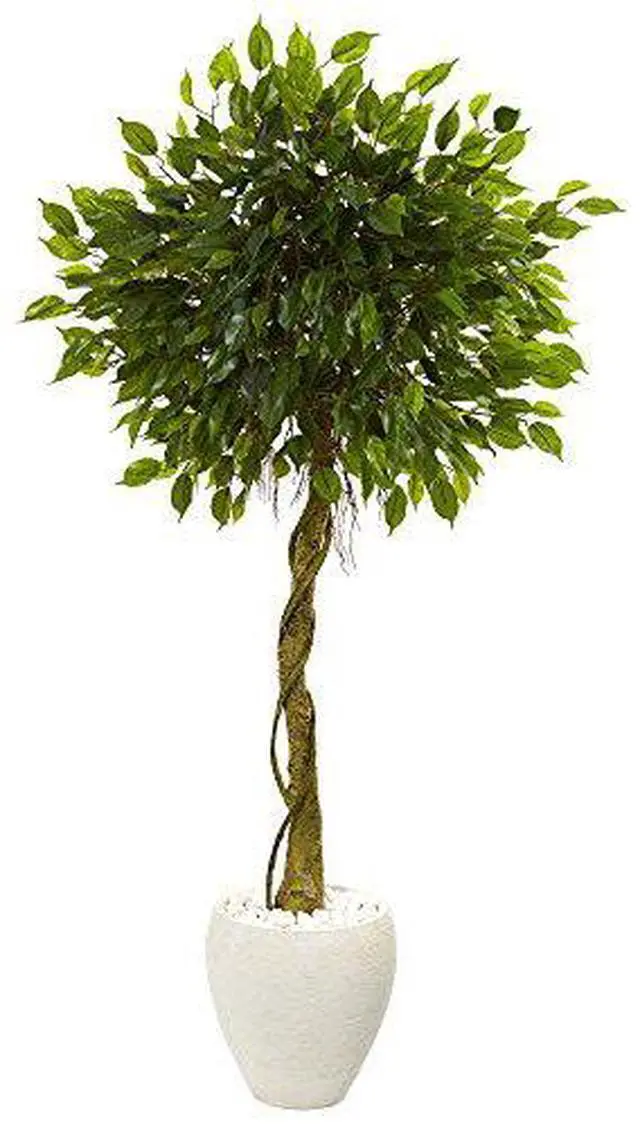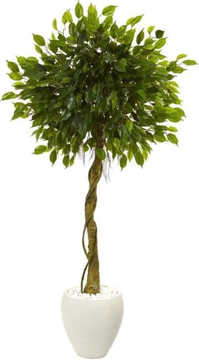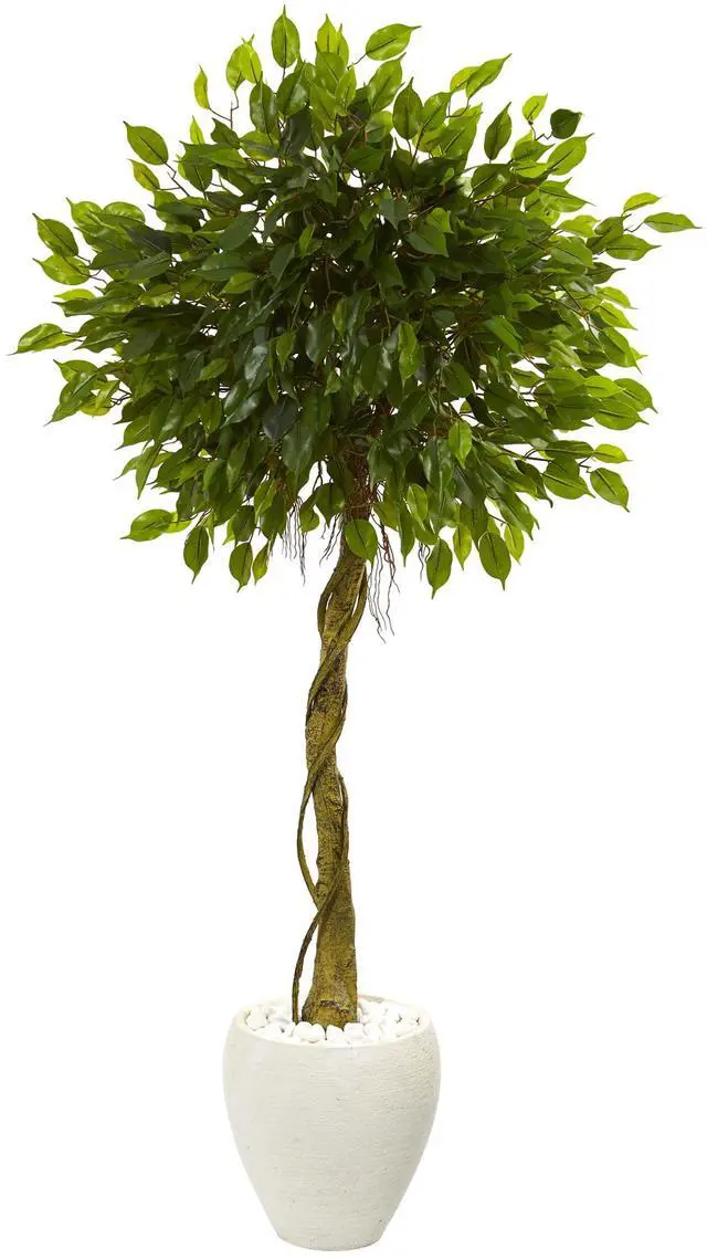 Roots wrap around a natural-looking trunk with this detailed artificial ficus tree topped with lush- carefully made green foliage. Planted in an attractive white oval planter topped with river rocks- this tree is ideal for a seating area. Place it in a corner next to your magazine rack or opposite a floor lamp.
