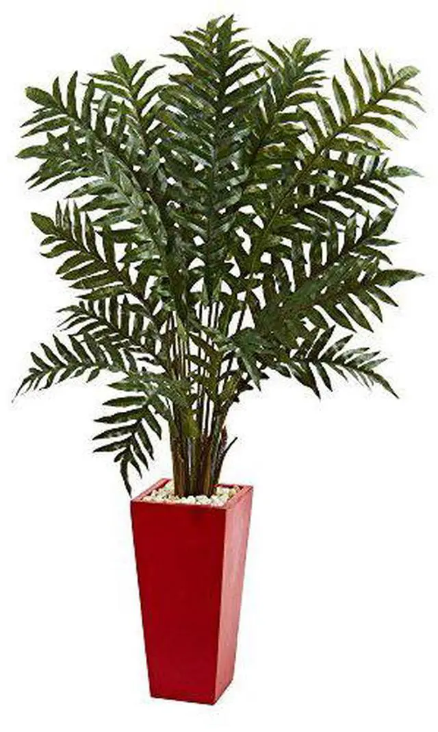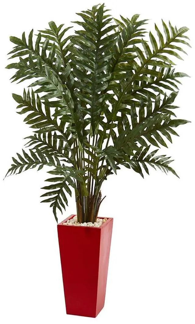A green- rich- full artificial evergreen plant brings the beauty of a tropical rainforest into your home with lush fronds fanning out above the included red planter. Carefully made to look just like the real thing- confidently place this near your potted faux flowering plants to make the arrangement fuller and more lush.