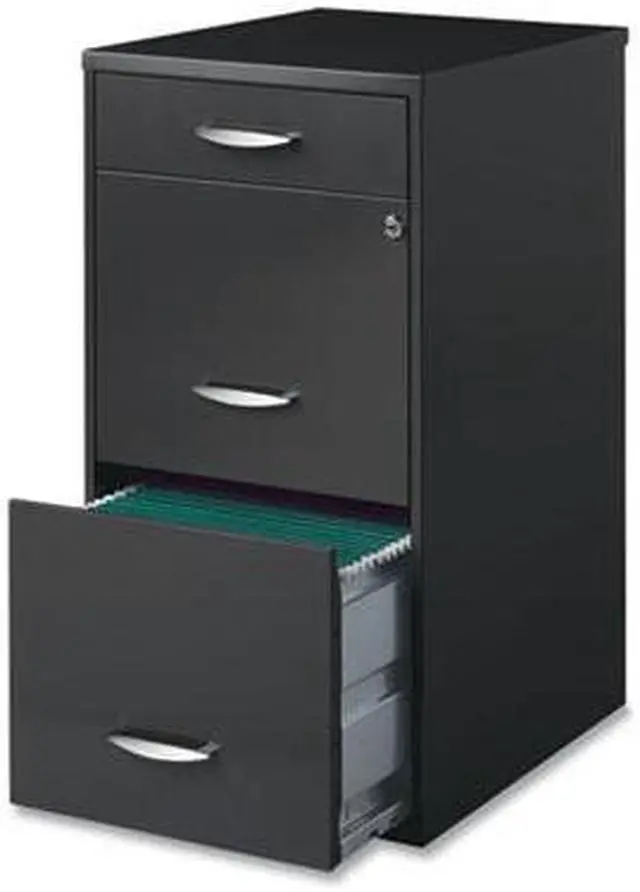 The Office Designs 3-Drawer Utility File Cabinet in Charcoal lets you easily store supplies and organize records in your home or office. This vertical file cabinet has two 18" deep drawers for letter-size hanging files and one accessory drawer for pencils, pens and office tools. Chrome pulls and glide suspension help make opening and closing the drawers a breeze. The Office Designs 3-Drawer File Cabinet is made with lightweight yet tough steel and includes a built-in lock to secure your files. Three-quarter drawer extension. Pencil/File/File Format. Drawer Quantity: 3; Drawer Configuration: Pencil/File/File; Anti-Tip Mechanism Indicator: No; Color: Charcoal.