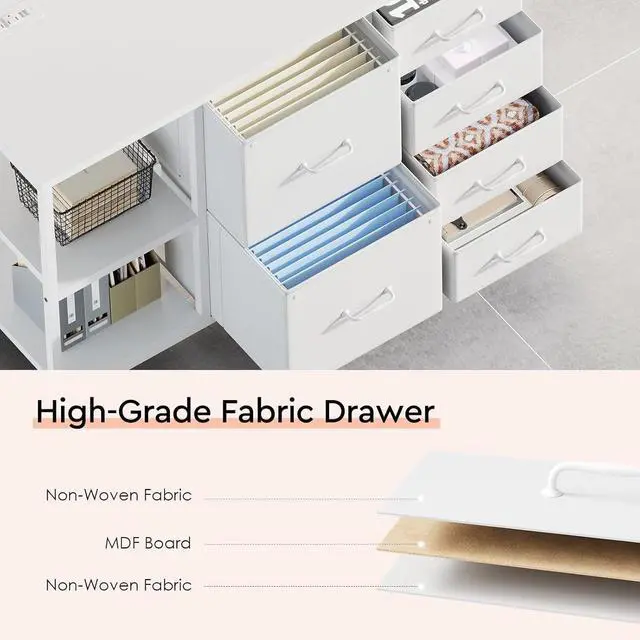 [Office Storage Solution] This file cabinet, featuring 6 fabric drawers and shelves, is designed to easily organize stationery, files, and other home office supplies. Makes it an ideal choice for both offices and home spaces